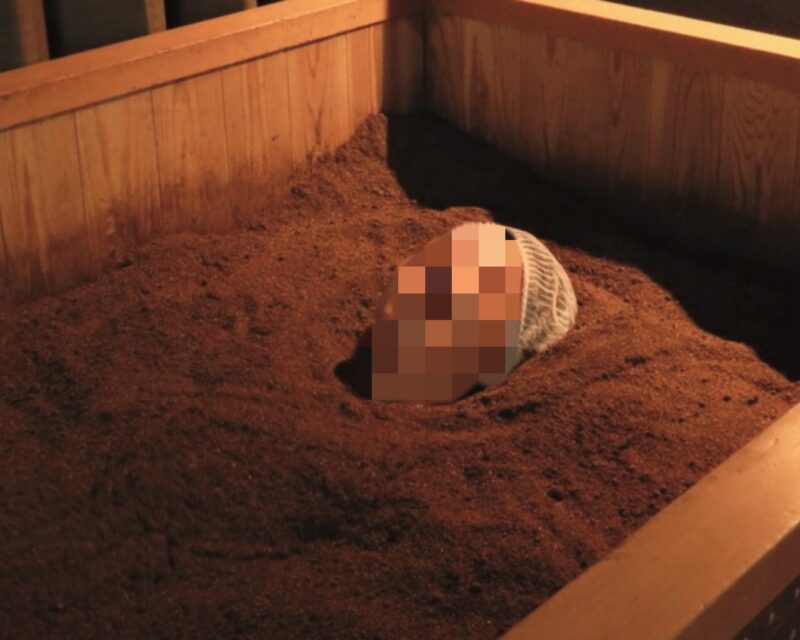 全身埋まっている状態なので、背面はもぞもぞ体を動かせば温まり直せますが、お腹や肩、足先などはスタッフの方に新たに被せ直してもらうと再度温まりやすくなります。