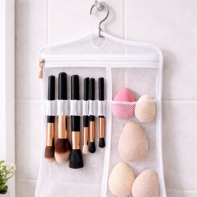 吊り下げ型の洗濯ネットは通気性が良く、メイクブラシやスポンジをより早く乾かしやすくしてくれます。