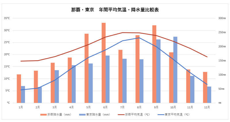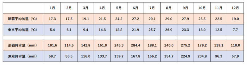気象庁で発表されている那覇と東京の平均気温と降水量のデータ(1991年~2020年)を表にまとめて比較しました。