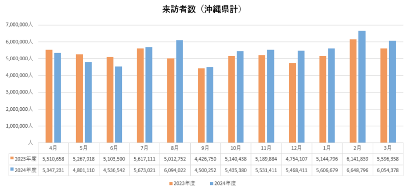 沖縄県公式ウェブサイトでの来訪者データよりグラフを作成しました。