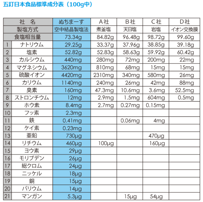 ぬちまーすは、一般的な塩よりも塩分が25%も低く、海洋成分が21種類含まれており、「マグネシウム」は、一般的な塩の200倍含まれいるため体にとてもいい塩なのです。